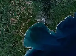 Gisborne boasts a large stretch of coastline encompassing the Waikanae and Midway, Kaiti, Sponge Bay, Wainui and Makorori white sand beaches, which are popular for swimming and surfing.[21] Sometimes referred to as the 'City of Rivers', Gisborne sits at the convergence of the Waimata, Taruheru and Tūranganui rivers.[22] The Tūranganui, only 1.2 kilometres long, is the shortest river in New Zealand.[23]