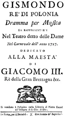 - ^ a b Briani, Francesco; Vinci, Leonardo (1727). Gismondo, re' di Polonia; dramma per musica da rappresentarsi nel teatro detto delle dame nel carnevale dell'anno 1727 (1st ed.). Rome: Bernabò.