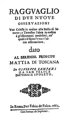 - Ragguaglio di due nuove osservazioni una celeste in ordine alla stella di Saturno; e terrestre l'altra in ordine a gl'istrumenti medesimi, co' quali s'e fatta l'una e l'altra osservazione (in Italian). Roma: Fabio Di Falco. 1664.