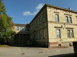 In 1982, the building was declared a national monument.[4] Since the station staff was withdrawn in the 1990s, the building has been unused and is empty. Damage caused by decay are clearly visible. In many places the plaster has crumbled and the decorative elements are partially destroyed.[4] It is now also listed in the heritage list of station buildings.[9] In the autumn of 2012, the station building was bought by an investor for renovation and use to house shops, refreshments and services, particularly for the Federal horticulture show (Bundesgartenschau) that is taking place in the region in 2015.[10]