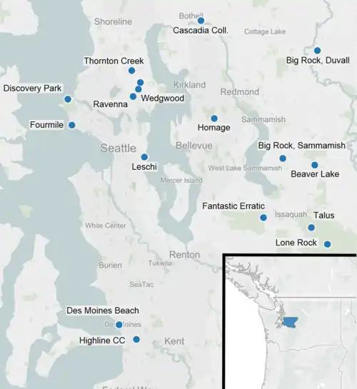 | Homage artwork boulders, three locations in Bridle Trails neighborhood of Bellevue,[30] using "local granite boulders".[31] Exposed granitic bedrock does not occur in western King County.[32]