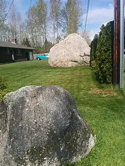 Unnamed erratics near Market Place road in Lake Stevens. Largest is unusual pink granite, approximately 12 by 20 feet (3.7 m × 6.1 m) in size, and 10 feet (3.0 m) tall.[14]