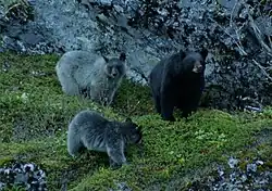 The glacier bear (Ursus americanus emmonsii), sometimes referred to as the "blue bear", is a subspecies of American black bear with silver-blue or gray hair endemic from Southeast Alaska, to the extreme northwestern tip of British Columbia, and to the extreme southwest of the Yukon.[2][3] The Tlingit name for the glacier bear is a reference to their size, elusiveness, and ability to visually blend into snowfields: "sik noon", which means "a bear that disappears".[4] Little scientific knowledge exists of their total extent and the cause of their unique coloration. Most other black bears in southeast Alaska are listed under the subspecies Ursus americanus pugnax.[5][6] The USDA Forest Service lists U. a. emmonsii as one of several subspecies of black bears, although no evidence supports the subspecies designation other than hair coloration.[7]