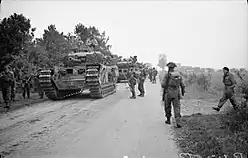 In the spring and summer of 1939, the Territorial Army was ordered to be doubled in size, in order to meet the threat of Nazi Germany. As a result, the 1st Battalion raised a duplicate unit, the 2nd Battalion which was assigned to the 46th (Highland) Infantry Brigade, 15th (Scottish) Infantry Division. With the division, the 2nd Battalion remained in the United Kingdom until it was sent overseas, to France, in June 1944. The battalion fought in the Battle of Normandy in Operation Epsom and the Second Battle of the Odon, followed by Operation Bluecoat and the subsequent Allied advance from Paris to the Rhine. The battalion later played a small part in Operation Market Garden, later taking part in Operation Veritable and crossing the Rhine in Operation Plunder, finally advancing into Germany in the Western Allied invasion of Germany. During Operation Epsom "the 2nd Battalion, The Glasgow Highlanders lost 12 officers and sustained nearly 200 casualties, mainly around the hotly contested village of Cheux. Total strength of this battalion was approximately 35 officers and 786 other ranks; thus one day's losses amounted to 34% of their officers and nearly 25% of the entire rifle battalion."[15]
