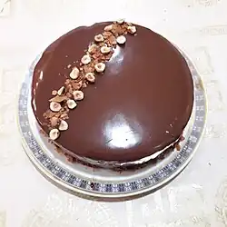 In cooking, a glaze is a glossy, translucent coating applied to the outer surface of a dish by dipping, dripping, or using a brush. Depending on its nature and intended effect, a glaze may be applied before or after cooking. It may be either sweet or savory (in pâtisserie, the former is known as glaçage); typical glazes include brushed egg whites, some types of icing, and jam (as in nappage), and may or may not include butter, sugar, milk,[1] oil,[2] and fruit or fruit juice.[3]