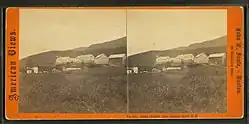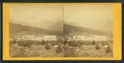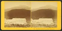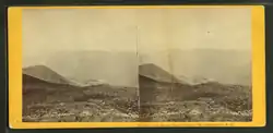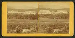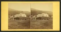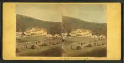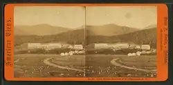 The completion of the Grand Trunk Railway in 1851 established a route from Portland, Maine, to Gorham, New Hampshire, and brought increased visitors to the area. John Bellows converted a farmhouse into a hotel the same year and then sold it in April 1852 to J. M. Thompson, who renamed it the Glen House and finished work on its rooms.[1] Expanded by 1866, the grand hotel featured views of Mount Washington, Tuckerman Ravine, and the northern Presidential Range. Guests could visit Mount Washington on the newly opened Carriage Road (now the Mount Washington Auto Road) to its summit, visit other natural attractions in the area, or recreate in the hotel's game rooms, parlors, library, listen to an orchestra, dance, play lawn tennis, fish, play croquet, hike, horseback ride, enjoy a guided carriage ride, or take in a theater show.[2] Guests included Albert Bierstadt, and the Bierstadt Brothers captured stereoscopic photographs of scenery in the area including a bear. John P. Soule, G. W. Woodward, Nathan W. Pease, and the Kilburn Brothers also captured stereoscopic images from the area, including mountain landscapes and other scenery as well as some of the grand hotel and its interior spaces. In 1869, Albert Bierstadt discovered hotel proprietor Col. Joseph Mariner Thompson's body down river from his sawmill following a heavy fall rainstorm. Ownership was then taken over by the Milliken brothers. This first Glen House was completely destroyed by a fire in 1884.