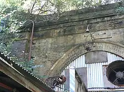 The eastern entry is similar to the western entry, although the flanking piers are a little wider due to the slightly wider railway cutting. This is in part due to the approach to hillside at the western cutting being generally steeper.[3]