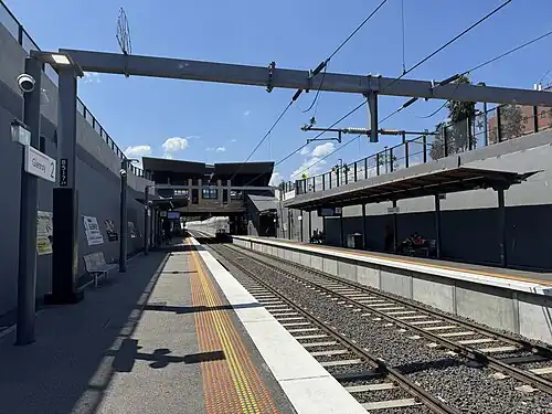 Glenroy railway station is a commuter railway station located in the northern suburb of Glenroy in Melbourne, Victoria, Australia.[5] The station opened on 24 January 1887, with the former ground level station closed and demolished in April 2022 and the current lowered rail trench station provided in May 2022 by the Level Crossing Removal Project.[6]