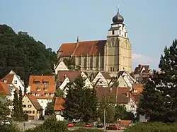 The "Stiftskirche" with its bell tower housing the Glockenmuseum Stiftskirche Herrenberg