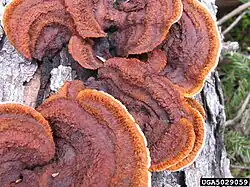 The Gloeophyllales are a phylogenetically defined order of wood-decay fungi that is characterized by the ability to produce a brown rot of wood.[1] It includes a single, identically defined family, the Gloeophyllaceae, in which are included the genera Gloeophyllum, Neolentinus, Heliocybe, and Veluticeps.