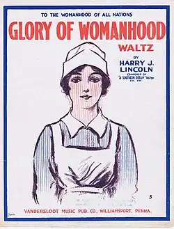 Glory of Womanhood is a World War I song written and composed by Harry J. Lincoln. It was first published in 1917 by Vandersloot Music Publishing Company in Williamsport, PA. The cover features the drawing of a nurse and is dedicated to the womanhood of all nations.[1]