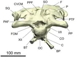 - The basal tubera (singular: basal tuber) or sphenoccipital tubercles[16] are a pair of tubercle-like extensions on the underside of the braincase that function as attachment sites for ventral neck muscles. They are formed by the basioccipital and the basisphenoid bones, and are strongly pronounced in saurischians but only moderately so in ornithischians.[17][18]