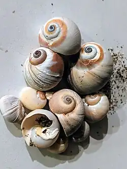 7. ^ Visaggi, C. C.; Dietl, G. P.; Kelley, P. H. (November 1, 2013). "Testing the influence of sediment depth on drilling behaviour of Neverita duplicata (Gastropoda: Naticidae), with a review of alternative modes of predation by naticids". Journal of Molluscan Studies. 79 (4): 310–322. doi:10.1093/mollus/eyt023. ISSN 0260-1230.