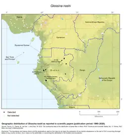 Glossina nashi was historically reported from a few countries in Central Africa, including Angola, Cameroon, the Central African Republic, the Congo, and Gabon.[1][2][3] However, a review of the scientific literature from 1990–2020 only found confirmation of G. nashi for Gabon.[4]