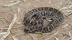 The color pattern consists of a light brown or gray ground color, overlaid with a pattern of 23–36 pairs of dorsolateral blotches or half-bands that oppose or alternate on either side of the middorsal line. These blotches are subelliptical in shape and brown in color with pale centers and dark brown to grayish brown borders. The pairs of blotches may or may not contact each other at the midline. They are separated laterally by light areas that are about one scale wide and extend downwards to the third or second scale rows. The head includes a dark and clearly defined postocular stripe that is sharply bordered above and below by yellow or white. The tip of the tail is yellow.[4]