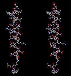 Glucagon ball and stick model, with the carboxyl terminus above and the amino terminus below