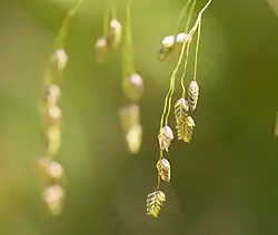 Flowers are produced in a panicle typically between June and September depending on location.[4] The panicle is typically open, containing few spikelets and each spikelet tends to droop giving the overall inflorescence a curved shape. Each spikelet is 3-5mm long and contains 5-10 individual florets. The lemmas are 2.9-4mm long.[3]