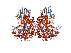 Members of this family consist of three structural domains. Deletion mutants of alpha-glucuronidase from Bacillus stearothermophilus have indicated that the central region is responsible for the catalytic activity. Within this central domain, the invariant Glu and Asp (residues 391 and 364 respectively from Bacillus stearothermophilus) are thought to form the catalytic centre.[8] The C-terminal region of alpha-glucuronidase is mainly alpha-helical. It wraps around the catalytic domain, making additional interactions both with the N-terminal domain of its parent monomer and also forming the majority of the dimer-surface with the equivalent C-terminal domain of the other monomer of the dimer.[9]
