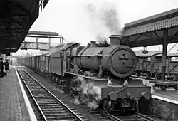 The station building was designed by Thomas Mainwaring Penson,[2] and is a Grade II listed building.[3] The station was built between 1846 and 1848 by the Shrewsbury and Chester Railway in a notable Florentine (or Italianate) style with white stucco facing and a small turret. The awnings and the footbridge were added later by the Great Western Railway (the footbridge was demolished in 1987). Although a very small village, Gobowen was the junction station for the much larger regional town of Oswestry some three miles away. When rail services to Oswestry ceased in November 1966, Gobowen was retained as the railhead for the surrounding area. There is a scheme in progress to open this branch as a heritage railway.[4] Until 1967 Gobowen was served by the GWR, latterly BR Western Region, express services between London Paddington and Birkenhead Woodside.