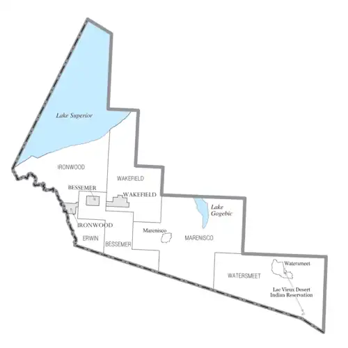 Gogebic County (/ɡˈɡbɪk/ goh-GHEE-bik or /ɡˈɡɛbɪk/ goh-GHEH-bik) is a county in the Upper Peninsula of the U.S. state of Michigan. As of the 2020 census, the population was 14,380.[2] The county seat is Bessemer.[3] Gogebic County is the westernmost county in Michigan, and is one of four Michigan counties within the Central Time Zone. Gogebic County borders Wisconsin to the south, and has a shoreline on Lake Superior to the north.