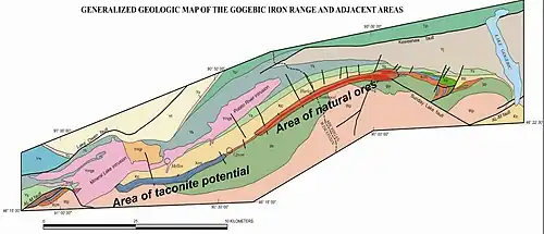 The Gogebic Range is an elongated area of iron ore deposits located within a range of hills in northern Michigan and Wisconsin just south of Lake Superior. It extends from Lake Namakagon in Wisconsin eastward to Lake Gogebic in Michigan, or almost 80 miles. Though long, it is only about a half mile wide and forms a crescent concave to the southeast. The Gogebic Range includes the communities of Bessemer and Ironwood in Michigan, plus Mellen and Hurley in Wisconsin.[1]