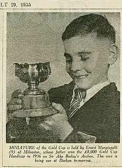 The Gold Cup is a Grade 3 thoroughbred horse race run over 3200m at Greyville Racecourse in Durban, South Africa. The first running of the race took place in 1920 however it was not run in 1942. The race is considered "Africa’s premier marathon for long-distance runners."[1] The race historically takes place on the last weekend of July, which coincides with the end of the racing season.
