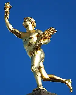 The Golden Boy was modelled on Giovanni da Bologna's 16th-century sculpture of the Roman messenger god of trade, profit and commerce, Mercury.[1][7] The sheaf of wheat in the statue' left arm represents the fruits of labour, while the torch in its right hand represents a call to youth to join his eternal pursuit of a more prosperous future. The statue faces in a north direction, pointing towards the Manitoba region to symbolize its importance as a provider of important natural resources and economic opportunity.