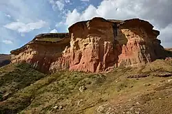 The following sequence of geological formations is visible in the park (starting from the bottom): the Molteno Formation, Elliott Formation, Clarens Formation, and Drakensberg Formation. The yellow-brown Golden Gate and Brandwag cliffs are made up of the Clarens formation. The layers in this formation are 140 to 160 m (460 to 520 ft) thick. The Drakensberg Formation comprises the basaltic lava that flowed over the desert. It forms the mountain summits in the park. On Ribbokkop, it is 600 m (2,000 ft) thick.[6] The Elliot Formation is a red mudstone where many dinosaur fossils have been found.