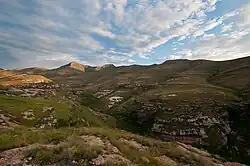 The park is 320 km (200 mi) from Johannesburg and is close to the villages of Clarens and Kestell, in the upper regions of the Little Caledon River.[4] The park is situated in the Rooiberge of the eastern Free State, in the foothills of the Maluti Mountains. The Caledon River forms the southern boundary of the park, as well as the border between the Free State and Lesotho. The elevation ranges from a 1,800 m (5,900 ft) plateau in the north to heights of 2,700 m (8,900 ft) in the south.[9] The highest peak in the park (and also in the Free State) is Ribbokkop at 2,829 m (9,281 ft) above sea level.[6]