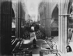 As the fiftieth anniversary of Victoria's accession approached, public anticipation of national celebrations began to grow, encouraged by the Liberal politician, Lord Granville. At the previous royal jubilee, the Golden Jubilee of George III, the king had been ill at Windsor Castle, so there was little precedent to follow.[2] In 1872, the recovery of Edward, Prince of Wales from a bout of typhoid fever was marked by Victoria processing through London to a thanksgiving service at St Paul's Cathedral; despite the queen's reluctance, this had proved to be a resounding success which had silenced the many critics of the monarchy.[3] For the Golden Jubilee, Victoria had informed the Conservative prime minister, Lord Salisbury, that she intended to have a thanksgiving service at Westminster Abbey, and ignoring the Biblical tradition that the start of the fiftieth year should be celebrated, the jubilee should mark the completion of fifty years. The service should reference Victoria's coronation, although the queen would not wear a crown or robes of state. This entailed considerable alterations inside the Abbey, which Lord Salisbury reluctantly agreed to finance, but he insisted that the queen should underwrite the rest of the costs.[4]