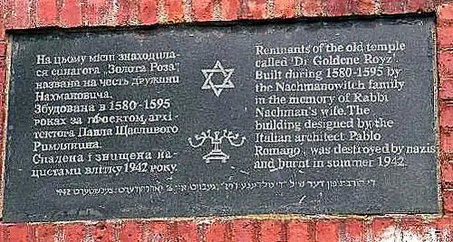 There is a plaque commemorating the Golden Rose Synagogue: "Remnant of the old temple called 'Di Goldene Royz'. Built during 1580-1595 by the Nachmanowicz family in the memory of Nachmanowicz's wife. The building designed by the Italian architect Pablo Romano was destroyed by Nazis and burnt in summer 1942."[8]