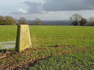Goleigh Hill rises about 2.5 kilometres west of the village of Empshott in Hampshire and is one of the East Hampshire Hangers. The top of the hill is open. Wooded areas on its flanks included Goleigh and Lye Woods to the west and Abbot's Copse to the east. Goleigh Farm lies on the northwestern slope of the hill with Goleigh Manor in the valley below it. There is a trig point at the summit.[2]