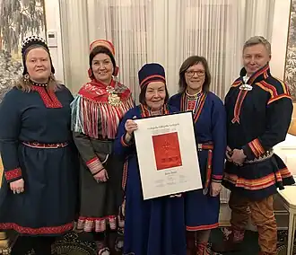 {{cite web}}: CS1 maint: multiple names: authors list (link) - ^ "Pohjoismainen saamen kielen palkinto Gollegiella kolmelle henkilölle" [Pan-Nordic Sámi language award Gollegiella to three people] (in Finnish). Finnish Ministry of Justice. November 21, 2014. Retrieved August 5, 2018.