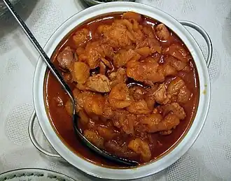 Gomgush (Armenian: ղամղուշ) is a traditional Armenian banquet stew, resembling dzhash (Ճաշ) but with added ingredients. A gomgush is often served at celebrations including weddings and banquets. Gomgush is a brothy stew including an array of meats and legumes, several vegetables, and spices. Gomgush is typically cooked in the tonir.