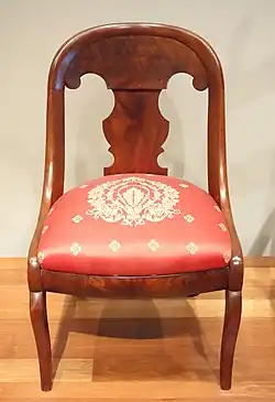 Gondola chairs are a type of low chair, often used at a writing desk, with a downward curved back that forms the arms of the chair. The Gondola chair is named after the 18th-Century Venetian gondola row boats which have a similar curvilinear shape.[1]
