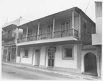 The Abreu Residence is a two-story, masonry and wood, commercial and residential building on the south side of Gonzalo Marin Street, in the historic center of Arecibo. The base level is of stuccoed load-bearing masonry and the main, upped floor is of timber and clapboard construction. The composition consists of four bays, spaced evenly and symmetrically at both the ground and upper stories. At the commercial base level, two central rectangular entrance bays are flanked by smaller, square window openings. Each opening is articulated by heavy, planar, masonry surrounds. Bay number two contains original, wooden, double doors with glass transoms, but bay number 3 has been altered to house aluminum and glass commercial doors. A planar pilaster strip frames the east and west extremes of the ground-floor. A continuous base mold and a simple cornice delineate the lower and upper limits of the masonry base-story, respectively.[3]