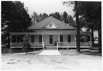 It is a wood frame rectangular, hipped roof building raised on brick piers. It is "almost encircled by a square post gallery, the rear portion of which was enclosed in the 1920s." Its front facade has five bays, with a transomed front door.[2]