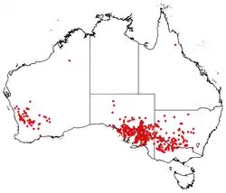 This goodenia grows in a variety of communities where water lies after rain in the drier areas of Western Australia, South Australia, New South Wales and Victoria.[2][3][4][5][6]