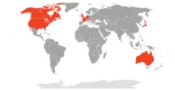 The full country list includes: Albania, Angola, Antigua and Barbuda, Argentina, Armenia, Aruba, Australia, Austria, Azerbaijan, Bahrain, Belarus, Belgium, Belize, Benin, Bolivia, Bosnia-Herzegovina, Botswana, Brazil, Burkina Faso, Cambodia, Canada, Cape Verde, Chile, Colombia, Costa Rica, Croatia, Cyprus, Czech Republic, Denmark, Dominican Republic, Ecuador, Egypt, El Salvador, Estonia, Finland, Fiji, France, Gabon, Germany, Greece, Guatemala, Haiti, Honduras, Hong Kong, Hungary, Iceland, India, Indonesia, Ireland, Italy, Ivory Coast, Jamaica, Japan, Jordan, Kazakhstan, Kyrgyzstan, Kuwait, Lao People's Democratic Republic, Latvia, Lebanon, Lithuania, Luxembourg, Macedonia, Malaysia, Mali, Malta, Mauritius, Mexico, Moldova, Namibia, Netherlands, Nepal, New Zealand, Nicaragua, Niger, Norway, Oman, Panama, Papua New Guinea, Paraguay, Peru, Philippines, Poland, Portugal, Qatar, Rwanda, Russia, Saudi Arabia, Senegal, Singapore, Slovakia, Slovenia, South Africa, South Korea, Spain, Sri Lanka, Sweden, Switzerland, Taiwan, Tajikistan, Tanzania, Thailand, Togo, Trinidad and Tobago, Turkey, Turkmenistan, Uganda, Ukraine, United Arab Emirates, the United Kingdom, the United States, Uruguay, Uzbekistan, Venezuela, Vietnam, Zambia, Zimbabwe [40]