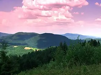 The Gorce Mountains (Polish: Gorce, Polish pronunciation: [ˈɡɔrt͡sɛ] ⓘ) are part of the Western Beskids mountain range spreading across southernmost Poland.[1] They are situated in Małopolska Province, at the western tip of the long Carpathian range extending east beyond the Dunajec River for some 1,500 kilometres (930 mi). The Gorce are characterized by numerous ridges reaching in all directions for up to 40 kilometres (25 mi) east–west with a series of higher elevations cut by deep river valleys.[1]