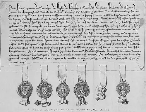 In 1341 Theobald Russell "de Gorges” adopted the Gorges arms used by his uncle and grandfather, that is to say, those taken from their de Morville heiress who brought them Wraxall. In 1347 he was challenged by Sir John Warbleton (or Warburton), a knight from Cheshire who happened to be serving with him at the Siege of Calais, who noticed they both bore the same arms on their shields, "Lozengy or and azure" (a field of gold and blue lozenges). The case was brought before a court of honour convened at Calais and presided over by Henry of Grosmont, Earl of Lancaster which adjudged on 19 July 1347 the disputed arms to Warbleton. Theobald Russell "de Gorges" thus added a "chevron gules" (red chevron) to the de Morville arms as a difference, in order not to contravene the judgement. Thus the new Gorges arms, known as Gorges Modern, became "Lozengy or and azure, a chevron gules",[12] and one of the more celebrated and historic heraldic cases heard in a military court was recorded. This coat of arms was afterwards used by Sir Ferdinando Gorges.[13] The ancient Gorges canting arms of "Argent, a gurges azure", being a blue whirlpool on a white (or silver) background, gurges signifying in Latin a Whirlpool,[14] had been retained some generations before by the senior Gorges line seated at Tamerton Foliot, Devon, the cadet line having married the de Morville heiress.