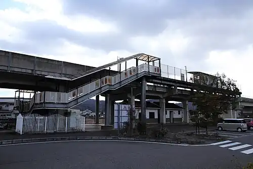 The station consists of two elevated opposed side platforms with a waiting room underneath. There are no other station facilities, and the station is unattended.