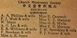 According to Annals of Religion in Mianyang (formerly known as Mien Yong or Mienchow), the presence of Anglicanism in Mianyang can be traced back to 1885, when a mission house church was built by Alfred Arthur Phillips and Gertrude Emma Wells of the Church Missionary Society (CMS) on Tongsheng Street.[2] In the late 1880s, two women representing the Church of England Zenana Missionary Society were working there.[4] This was followed by the entry of a CMS mission team into that city in 1894, led by James Heywood Horsburgh,[5] who expanded the church;[2] and Mianyang subsequently became the headquarters of the CMS Mission.[6] During the Republican Era (1912–1949), Tongsheng Street (通聖街, lit. 'All Saints' Street'; now known as 'Liberation Street' for political propaganda), as its name suggests, that brought together three religious buildings, namely, a Confucian temple, a Wenchang Taoist temple, which no longer exist, and the Anglican Gospel Church.[7]
