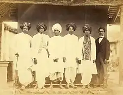 Six prize students for the year 1865 from the University of Madras photographed by a photographer from the Madras School of Industrial Arts.