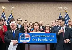 Under the provisions of the act, political contributions of up to $150 would be matched by a factor of six times more than the original donation as long as candidates meet certain requirements. They must not use their own money, not accept donations over $1000, have already received at least $50,000 from 1000 in-state donors, and decline most political action committee money.[2] In order to subsidize donations to political candidates, supporters said that it will close "corporate tax loopholes",[3] though no financing mechanism had been identified.[2] It was supported in print by Representatives Nancy Pelosi (D-CA), John Sarbanes (D-MD),[1] Annie Kuster (D-NH),[4] and Tulsi Gabbard (D-HI).[5]