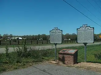 The historic marker for Governor's Land, with some of the farmland adjacent; the marker is the location at which the plaques for the Virginia Landmarks Register and National Register of Historic Places have been installed
