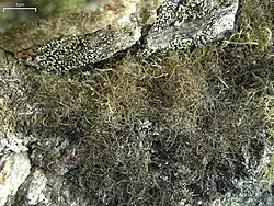 The lichen was first formally described by Swedish lichenologist Erik Acharius in 1810, as Cornicularia ochroleuca var. nigricans.[2] William Nylander promoted it to distinct species status in 1862, as Alectoria nigricans.[3] A colloquial name used in North America for the lichen is "gray witch's hair".[4]