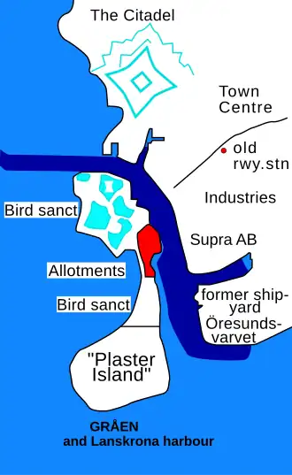 ![]() Gråen, an artificial island, protects Landskrona's natural deep water harbour. Deep water in dark blue colour.[1] | |