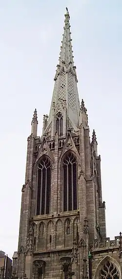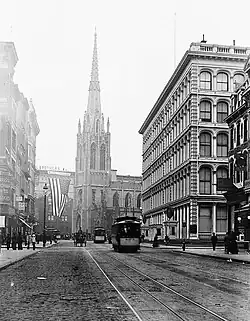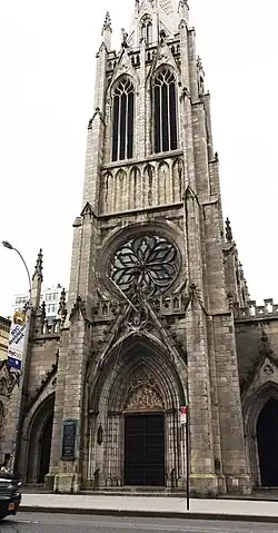 The church, which has been called "one of the city's greatest treasures",[8] is a French Gothic Revival[9] masterpiece designed by James Renwick Jr., his first major commission. Grace Church is a National Historic Landmark designated for its architectural significance and place within the history of New York City,[6][10][11] and the entire complex is a New York City landmark, designated in 1966 (church and rectory) and 1977 (church houses).[9]