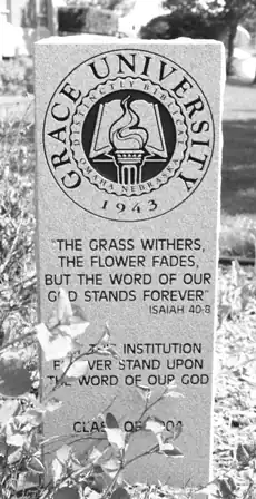 2. ^ Hatfield, D. "$1 Million Gift Establishes Grace University School of Professional and Graduate Studies". Grace in the News. Retrieved 26 September 2014.